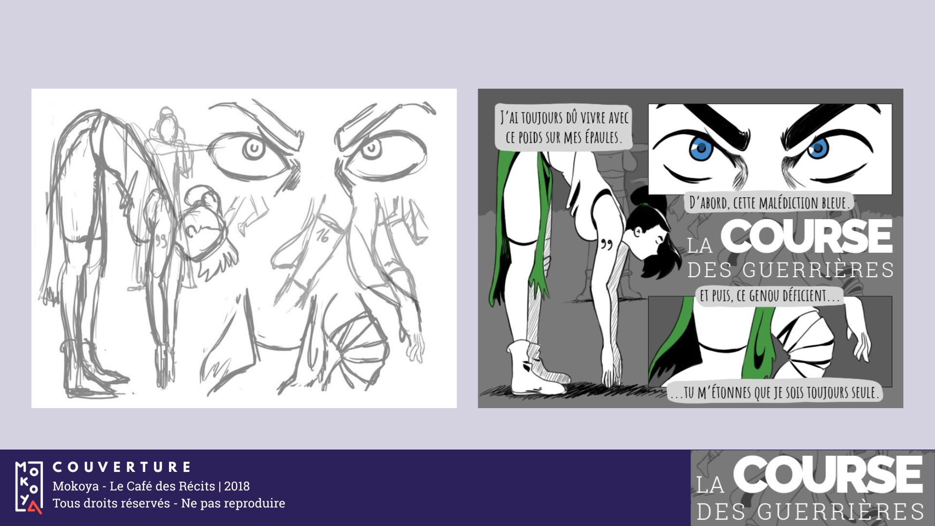 Le piège de piocher dans un lore existant est de vouloir détailler trop de choses auxquelles on est attaché. Alors j’ai simplifié l’univers au maximum, ne gardant que la forêt, les guerrières et le passé des personnages. Ainsi les 6 pages avant le début de la course servent à l’exposition tout en répondant au thème et à la contrainte. Elles servent ainsi à installer une forme de tension pour impliquer le lecteur dans l’issue de la course.