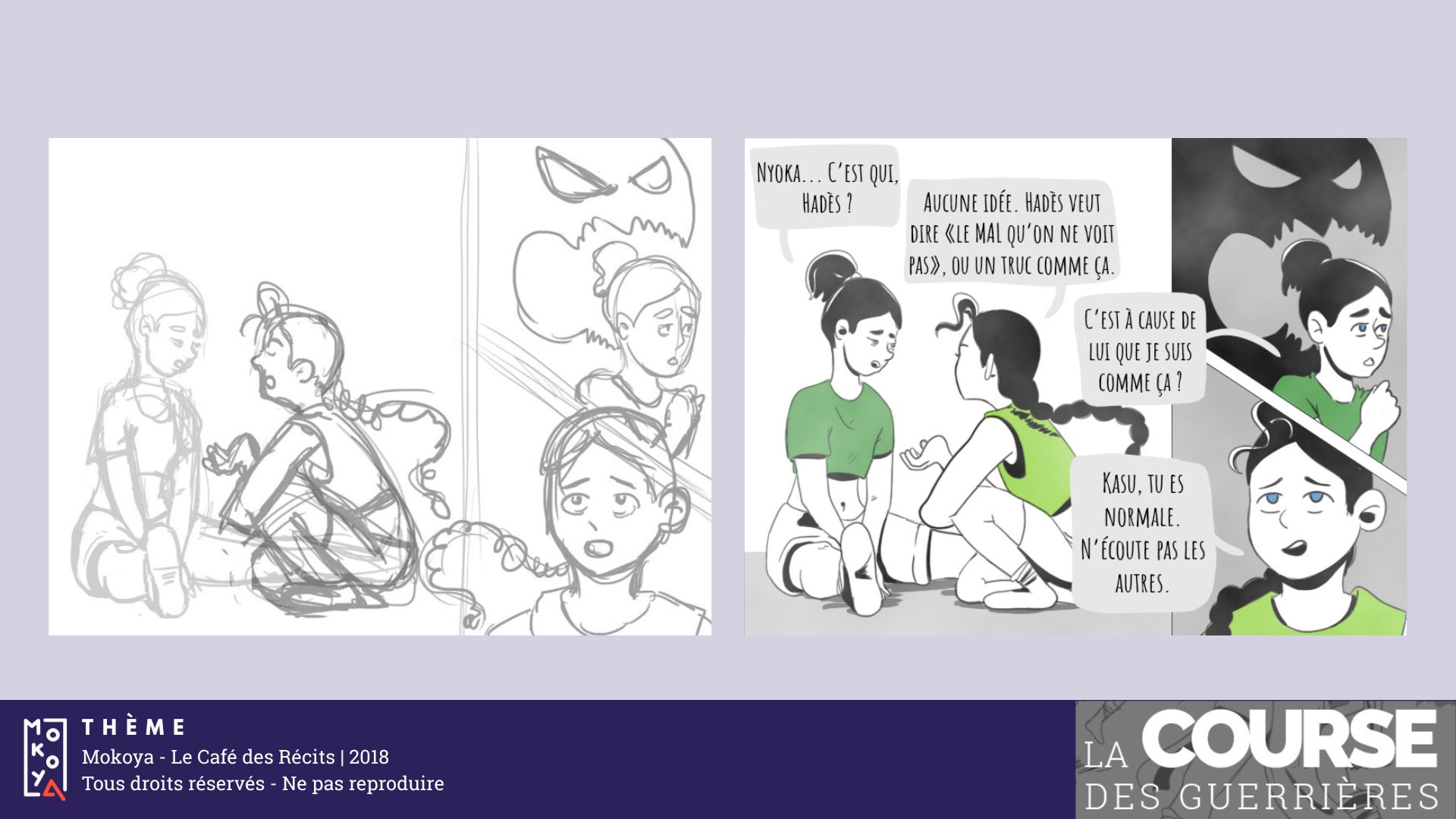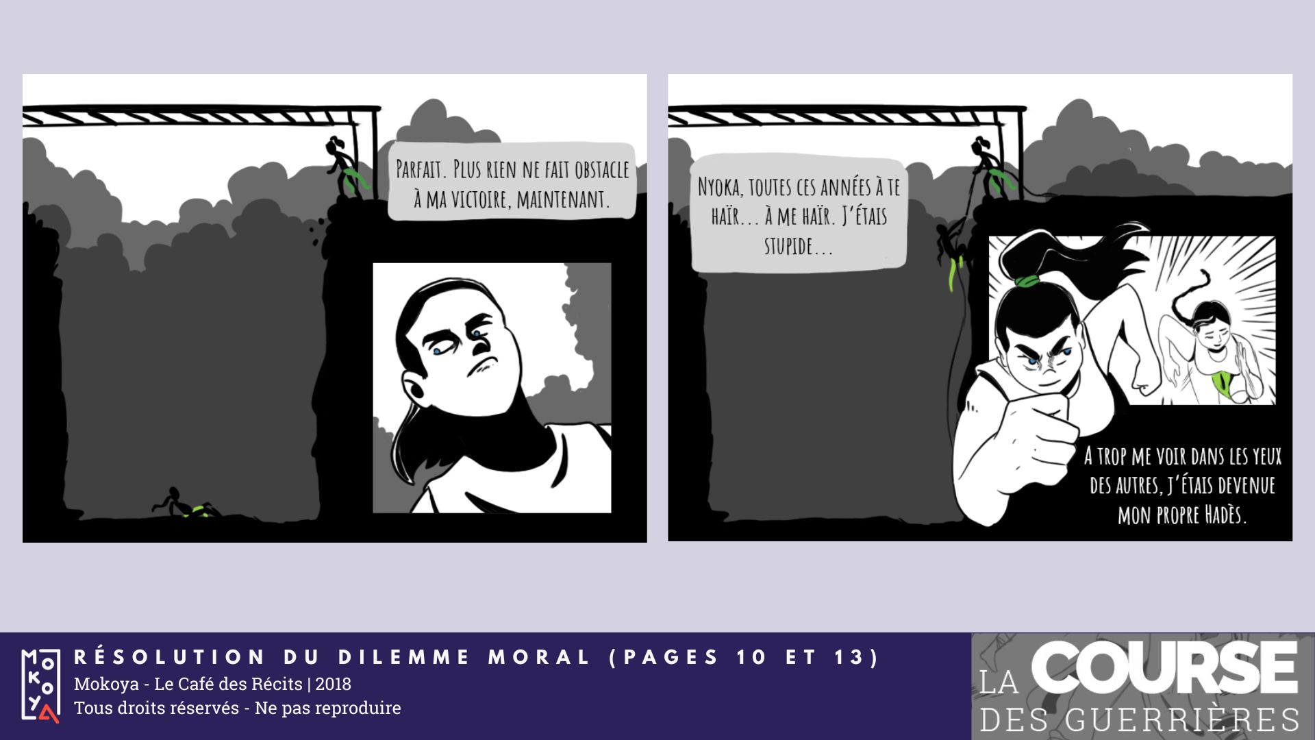 La Course des Guerrières est le résultat de ma participation aux 25hBD 2018. Il s’agissait de réaliser 12 pages en 25 heures avec le thème « Échapper à Hadès » et la contrainte « Deux pages doivent se refléter ».
